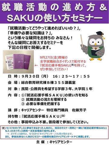 ※就活応援手帳『SAKU』は,9月27日開催の「全学就職総合ガイダンス」で